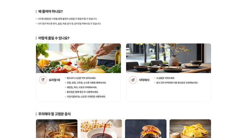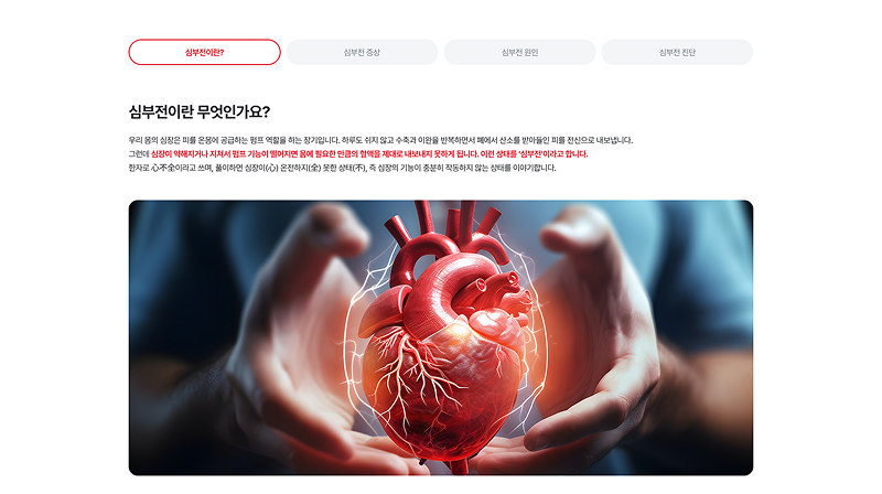 심부전 환자와 가족들에게 필요한 정보를 친근하게 전달하기 위해 부드러운 일러스트와 따뜻한 코랄 레드 톤을 매치하였습니다. 복잡한 의학 정보를 직관적인 카드 타입 레이아웃으로 재구성하여 사용자의 정보 접근성과 심리적 안정감을 동시에 높였습니다.